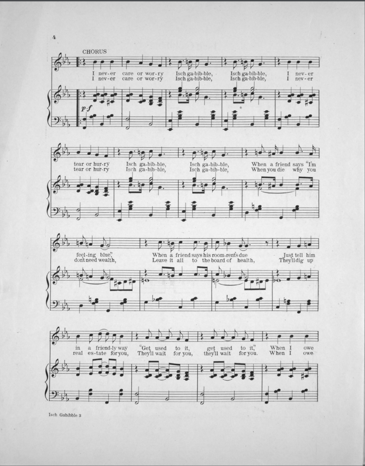 Some believe that "Ish Ka bibble" is a Yiddish phrase, but in reality it's a nonsense word that originated in a comedic song released in 1913 called "Isch Ga-Bibble," also known as "I Should Worry," a sentiment echoed in its refrain: "I never care or worry, Ish ga-bibble." Listen to an instrumental version of the song here.